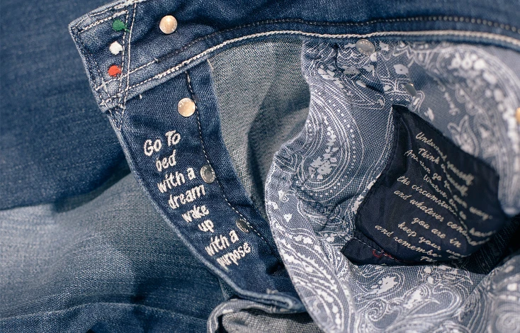 На внутрішньому боці пояса або в районі кишень Ви знайдете вишитий напис: "Go To Bed With A Dream, Wake Up With A Purpose", що означає: «Лягай з мрією, прокидайся з метою». Це особистий девіз засновника бренду, Ніколи Барделле.