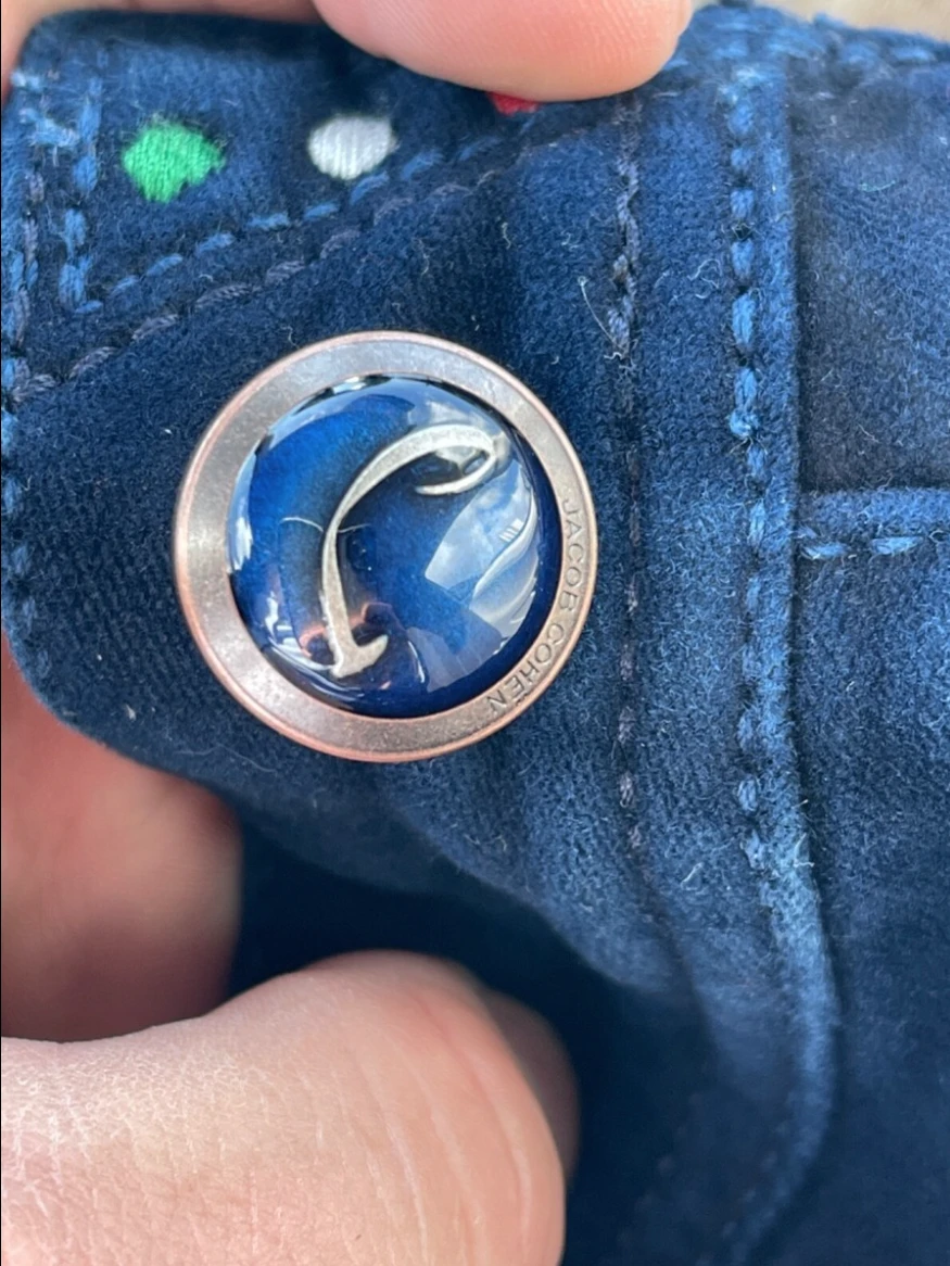 Jacob Cohen використовує ґудзики та заклепки, які часто покриті шаром срібла 925 проби – Sterling Silver або паладієм, про що свідчить відповідне мікрогравіювання на вивороті.
