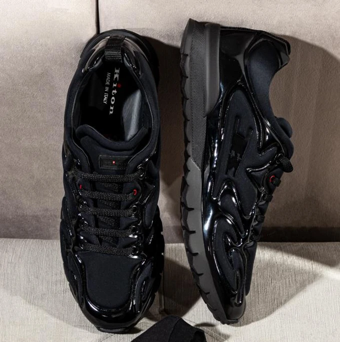 У взутті Kiton застосовується техніка фарбування, схожа на патину. Колір наноситься шарами вручну, створюючи глибину та переходи відтінків. У підробці шкіра виглядає плоскою, ніби її просто облили фарбою з пульверизатора.