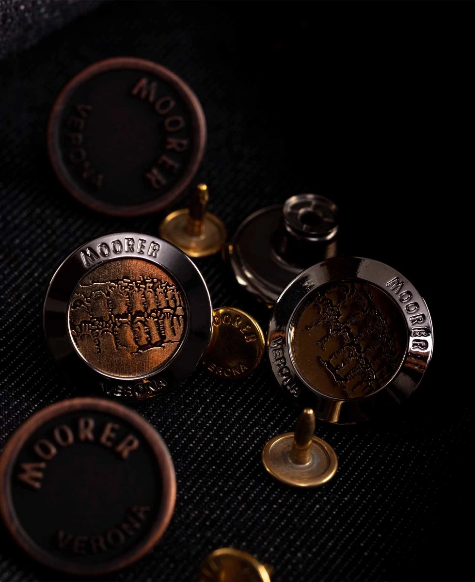 Гудзики часто пришиваються не нитками, а кріпляться на спеціальній ніжці або ленті, що виключає їх відрив. На торці або лицьовій стороні обов’язково є чітке гравіювання Moorer.