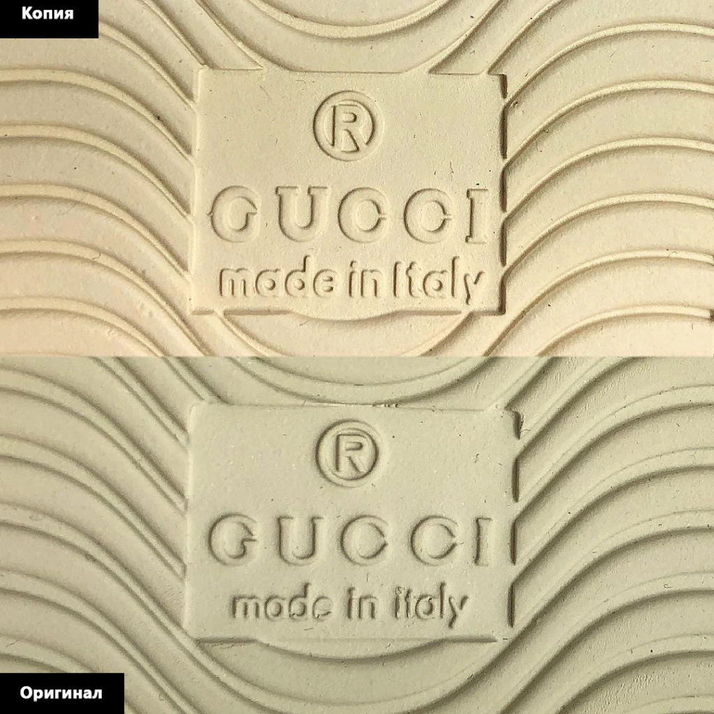 На подошве кроссовок или лоферов логотип Gucci часто сопровождается надписью «Made in Italy». Обратите внимание на написание: в подлинных моделях буквы выбиты очень тонко и изящно. Обычно у палева буквы часто кажутся жирными или имеют нечеткие края из-за дешевых форм для отливки резины.
