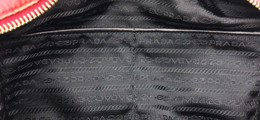 Оригинальный подкладочный шелк под названием Jacquard имеет чередующийся узор: слово PRADA и веревочный орнамент. Ключевая фишка: каждая вторая строка со словом PRADA перевернута вверх ногами. В репликах текст часто идет в одном направлении.